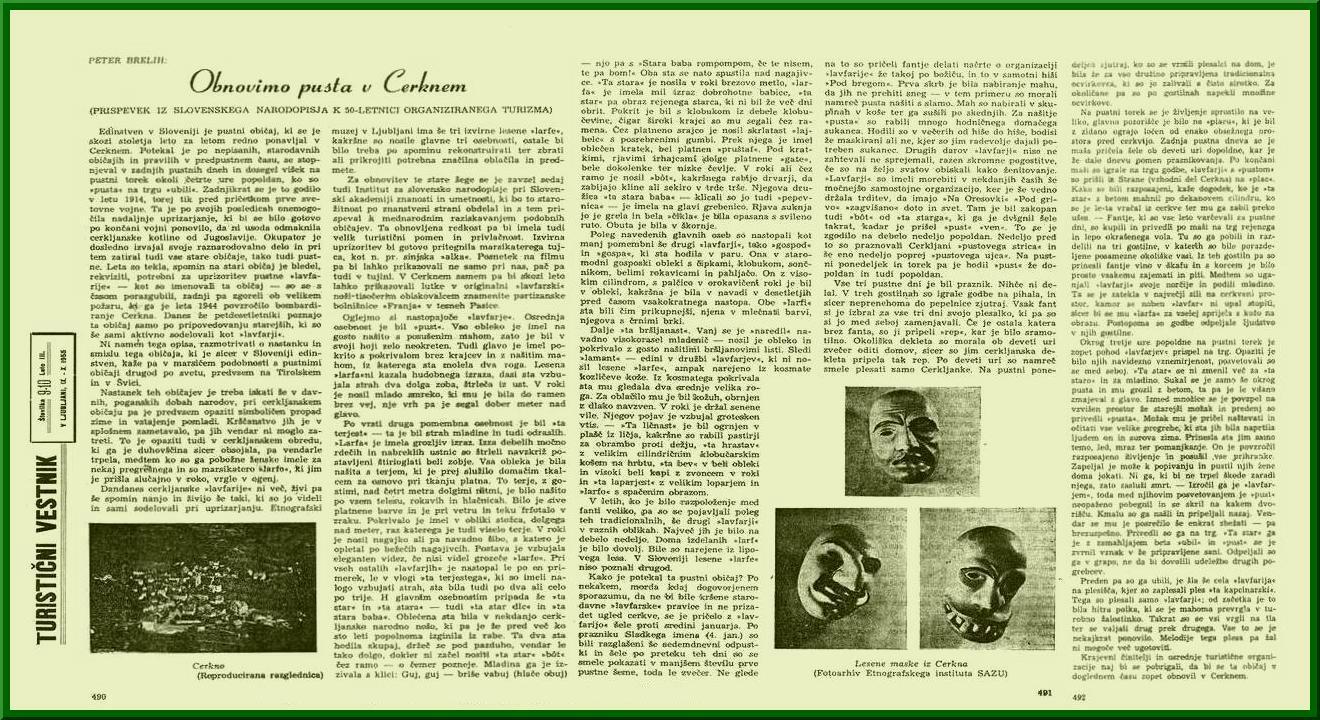Članek iz leta 1955 in ojavljen v Turističnemu vestniku o nameravani uprizoritvi pusta. Avtor članka je Peter Brelih in je shranjen na Institutu za narodopisje v Ljubljani.