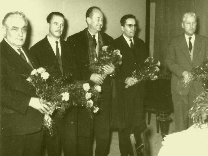 France Bevk, Cene Vipotnik, Ciril Kosmač in Kajetan Kovič na obisku v Cerknem. Na desni strani je Ciril Bevk, takratni ravnatelj glasbene šole. Vir: Moja zbirka