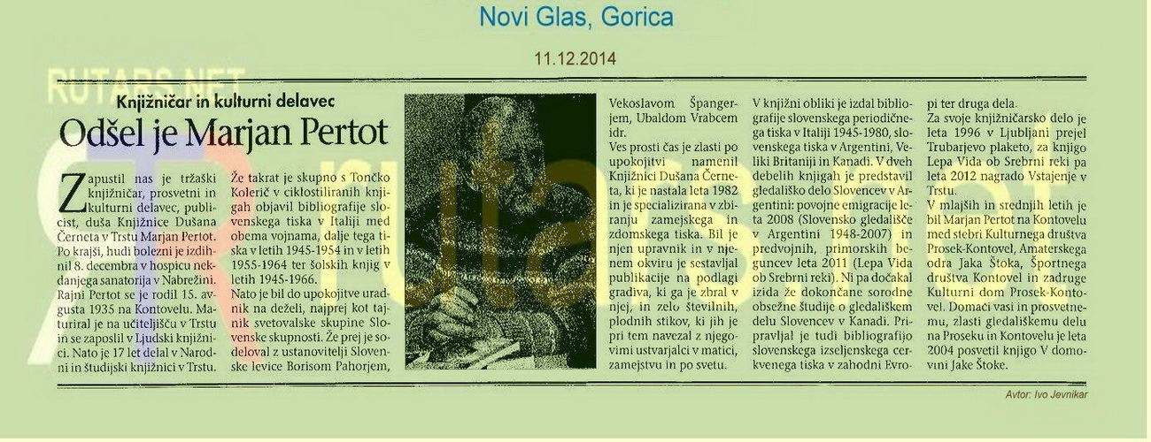 In memoriam Marjan Pertot (1935-2014) v Novem Glasu, Gorica 11.12.2014, spisal: Ivo Jevnikar - Trst 2014